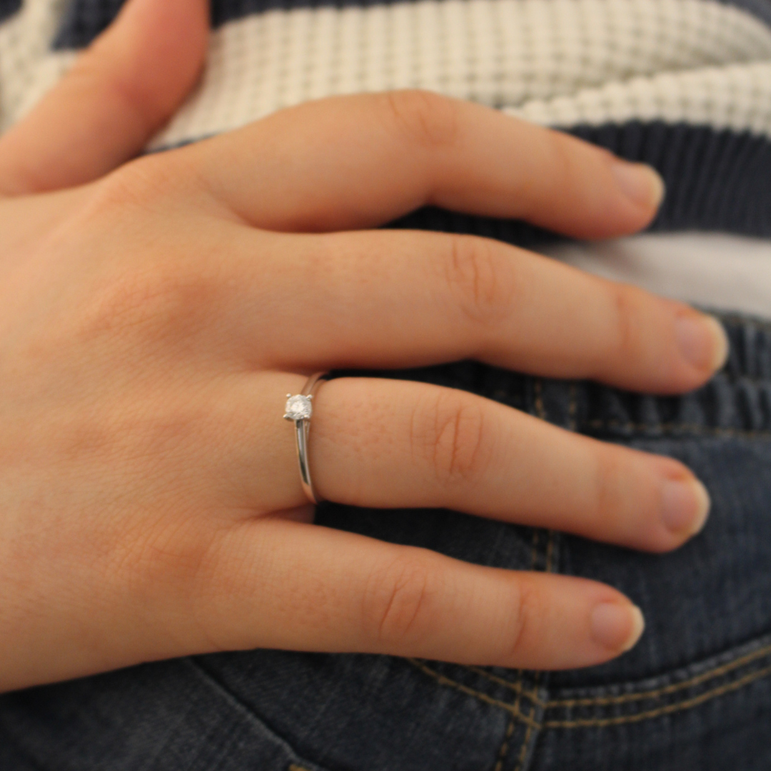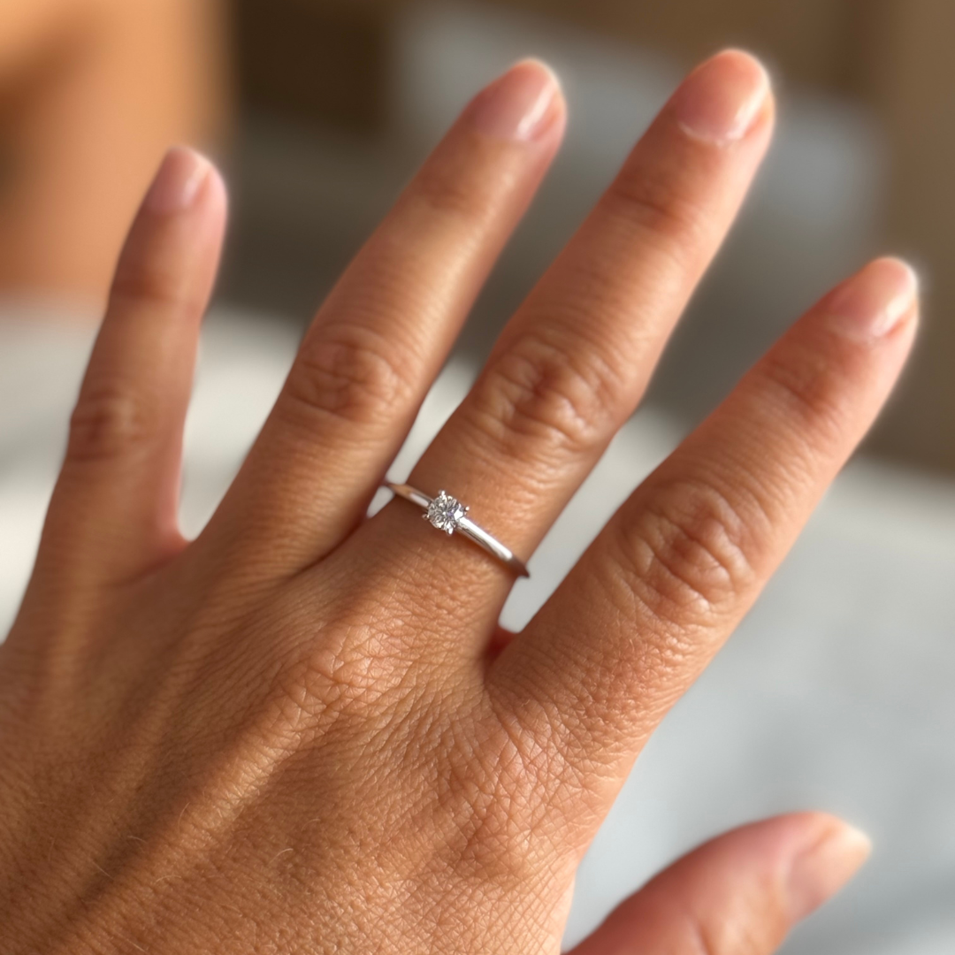 Un anillo con un diseño fino y elegante con una piedra central de una medida intermedia (es lo que llamamos la medida perfecta) que irradia luz mires por donde la mires.