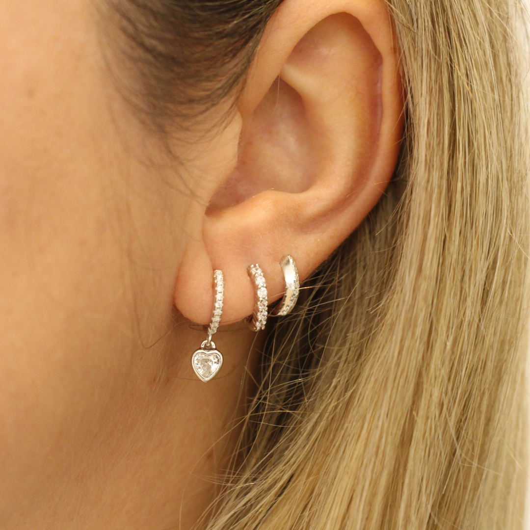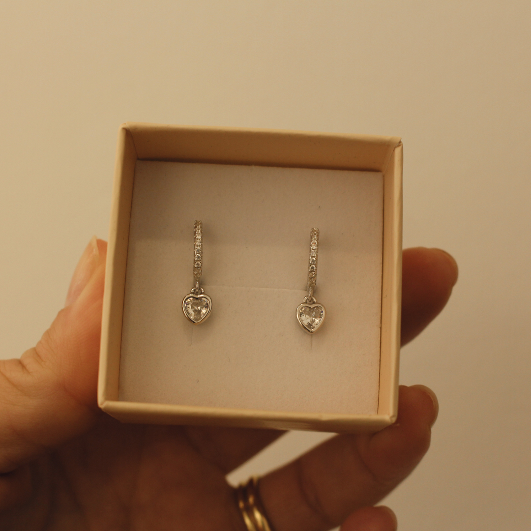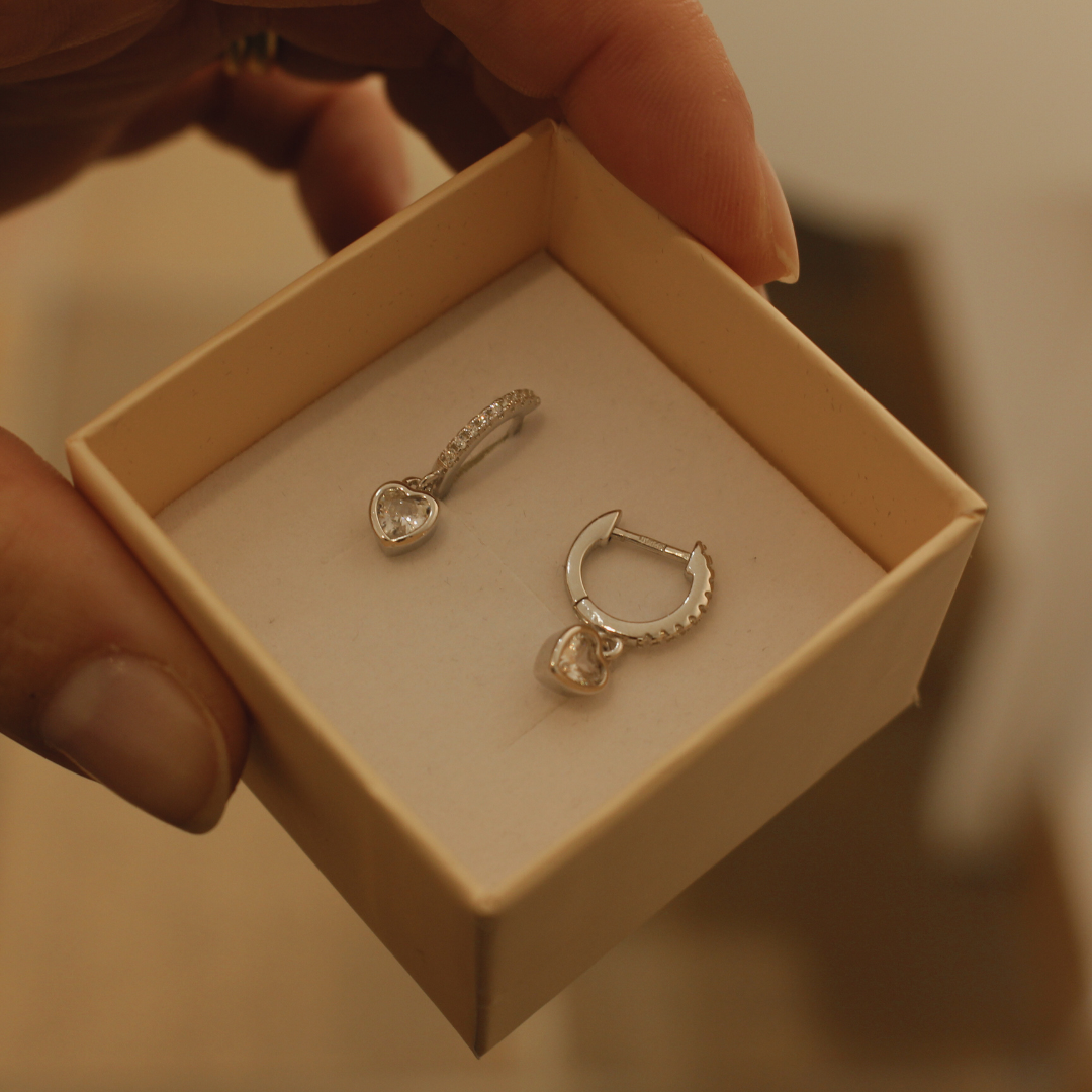 Delicados, dulces y con un aire romántico irresistible. Estos mini aritos de plata de ley con baño de rodio están adornados con circonitas blancas que brillan con cada movimiento, y un pequeño charm en forma de corazón que los convierte en el accesorio perfecto para enamorar a primera vista.