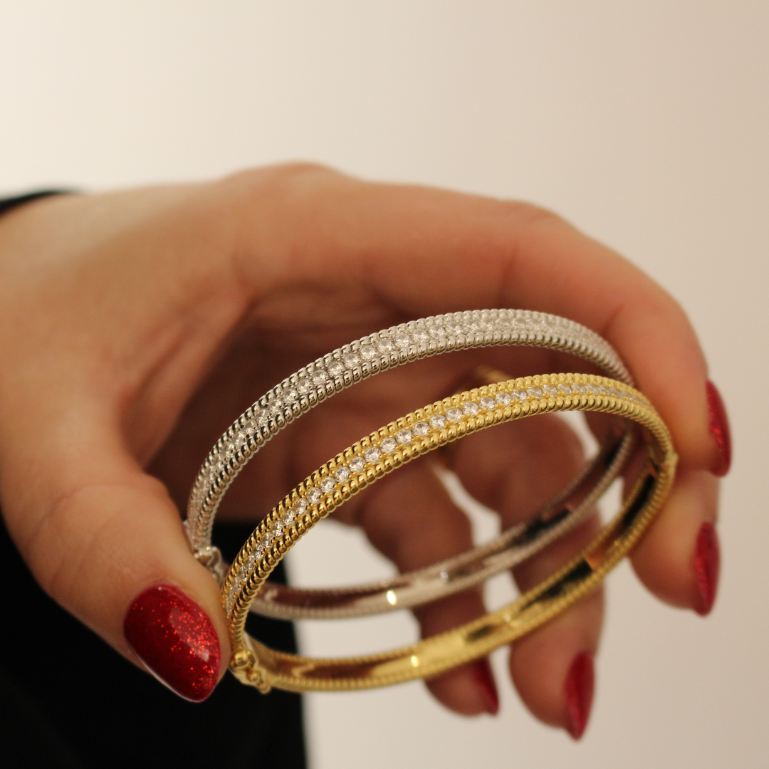 Pulsera rígida de plata maciza con un diseño trabajado y atemporal.