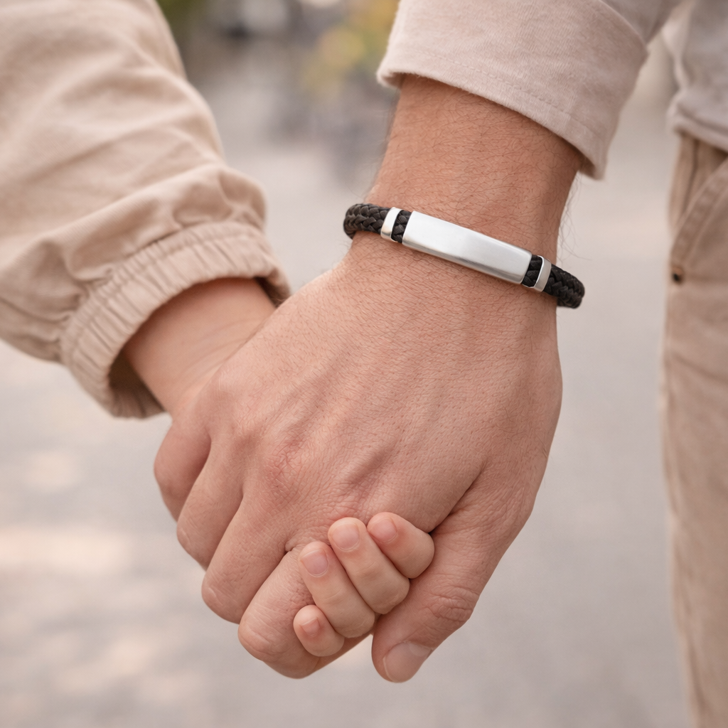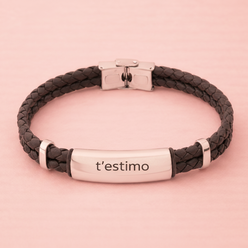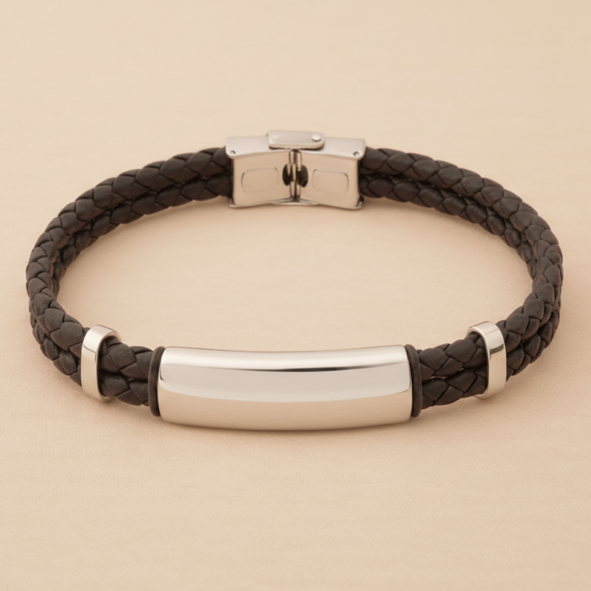Es una pulsera fuerte, masculina y con carácter, diseñada para acompañar el ritmo del día a día. Su doble cordón trenzado le aporta resistencia y estilo, mientras que su placa central de acero permite grabar ese nombre, fecha o palabra que lo dice todo.
